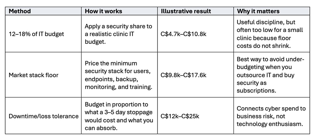 Hypothèses utilisées dans cet exemple : budget informatique estimé à partir des tarifs courants des services gérés au Canada et des besoins habituels en matière de logiciels et d'assistance ; configuration minimale de la pile technologique établie à partir de références tarifaires canadiennes pour la sécurité et la sauvegarde des e-mails, l'EDR, la surveillance et la sensibilisation ; tolérance aux temps d'arrêt et aux pertes basée sur une interruption de trois jours plus les efforts de reprise. Étant donné que les petites cliniques doivent faire face à des coûts de sécurité fixes qui ne diminuent pas, la décision devrait généralement se fonder sur la méthode la plus coûteuse des trois, et non sur la moins coûteuse.