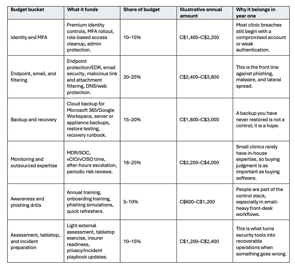 Une estimation réaliste pour cette clinique ne s’élève pas à 5 000 dollars canadiens ; elle se situe plutôt entre 12 000 et 18 000 dollars canadiens par an. Cette fourchette est suffisamment large pour financer l’infrastructure minimale viable sans prétendre que la clinique puisse constituer une équipe de sécurité de niveau entreprise. Elle est également suffisamment modeste pour être répartie sur une année.