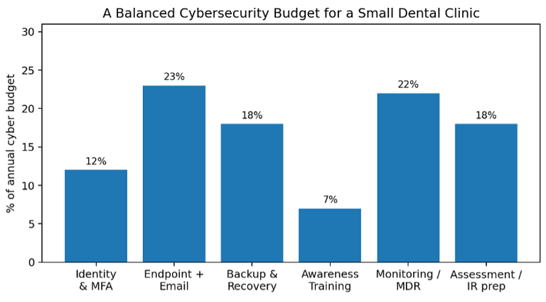 Ce cadre explique également pourquoi certains repères souvent cités doivent être utilisés avec prudence. Un repère mondial tel que 13,2 % du budget informatique constitue un point de référence utile, mais il doit être considéré comme un seuil minimal, et non comme un plafond. Dans les petits environnements soumis à des exigences de conformité strictes, comme les cliniques dentaires, l'économie de la sécurité est déterminée par des contrôles minimaux fixes et par le coût des interruptions. La clinique doit donc considérer la cybersécurité comme un budget de résilience : en partie informatique, en partie opérationnel, en partie lié à la confidentialité et en partie assurance de gestion.